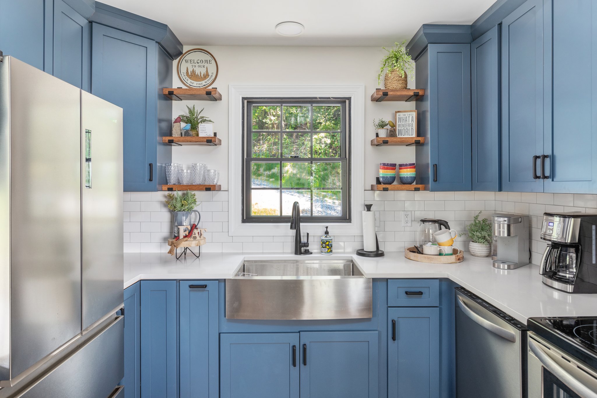 Red Gate Cabin boasts a full kitchen complete with cookware, utensils, refrigerator with icemaker, dishwasher, electric stove, microwave, blender, toaster, Ninja Air Fryer Oven Flip Up, a Keurig, regular coffee machine, a French press (can you tell we like our coffee), and electric hot water kettle! You’ll have everything you need to cook a holiday meal, bake a cake, just make coffee and toast, or use the microwave for simple reheating. And of course, wine glasses to sip vino during your afternoon wine and cheese happy hour are provided (you bring the wine and cheese)!