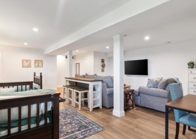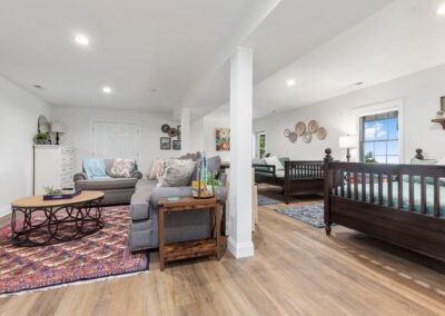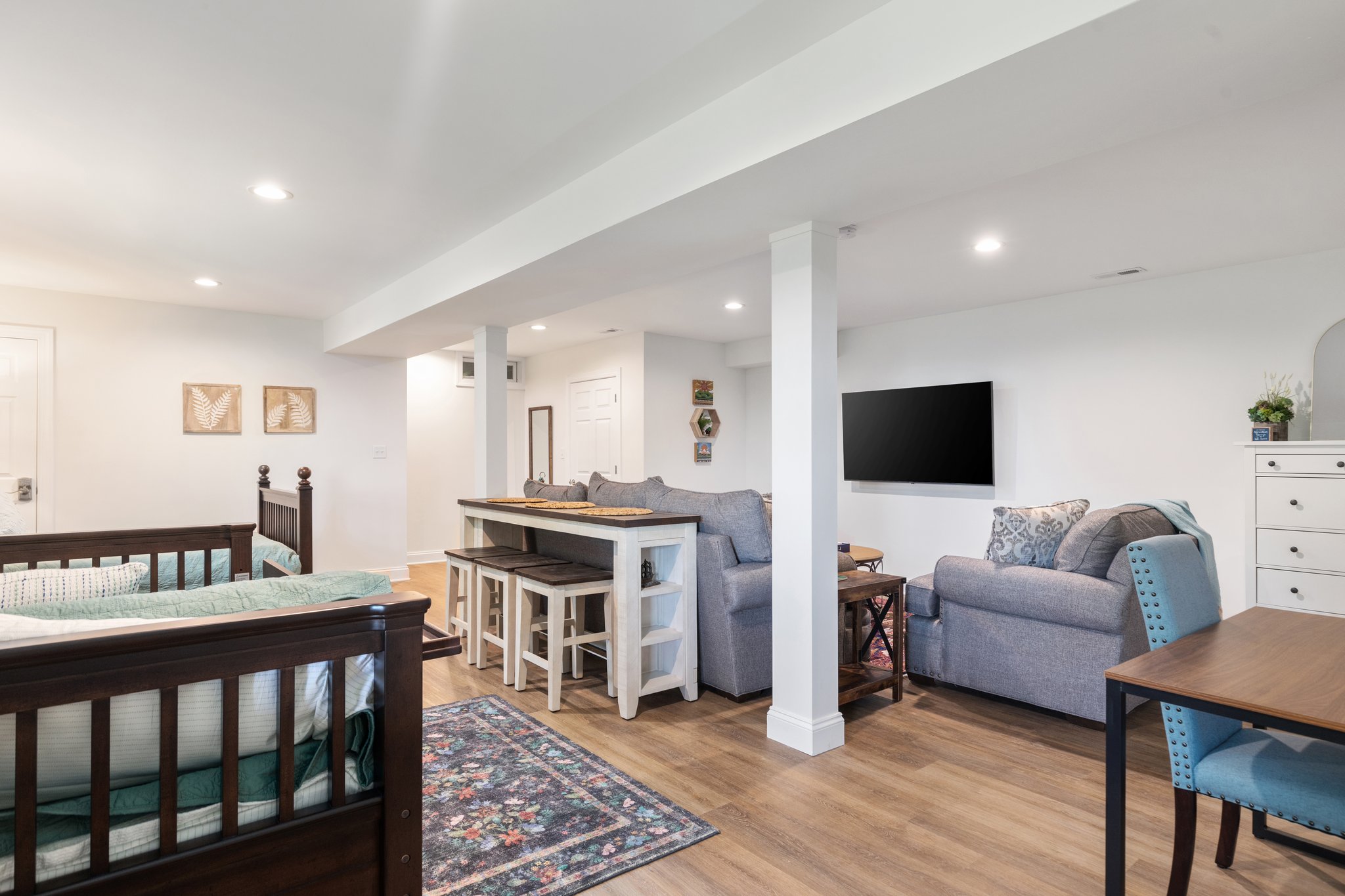 Two double beds in open room on the lower level