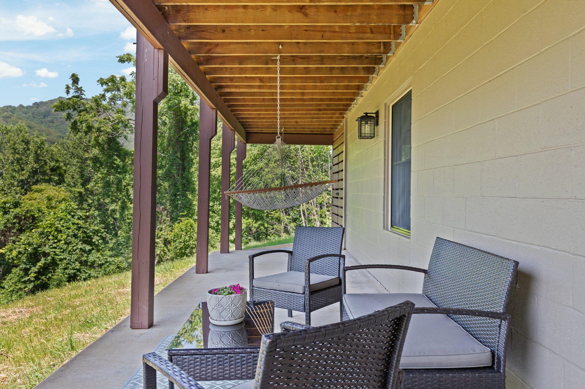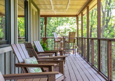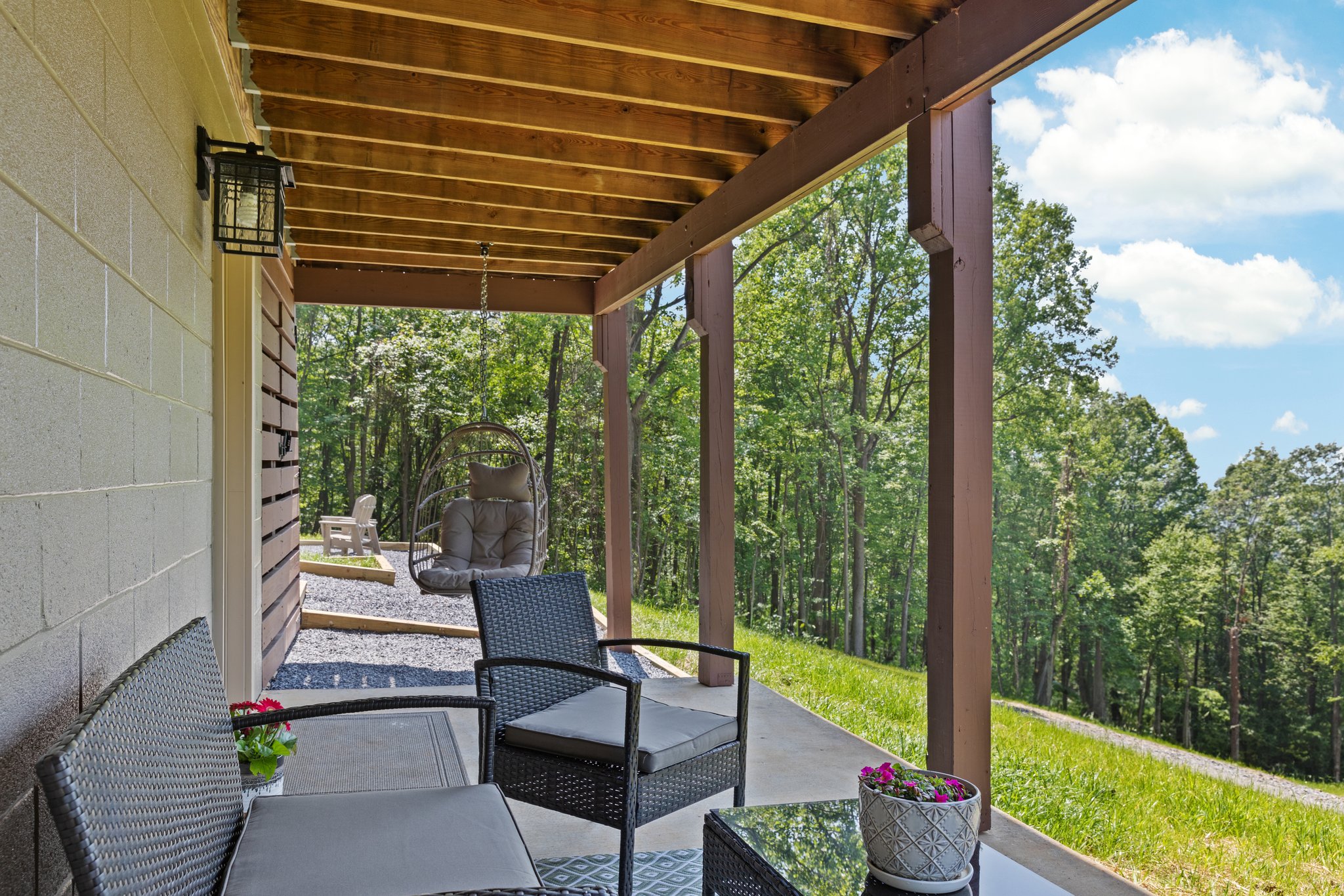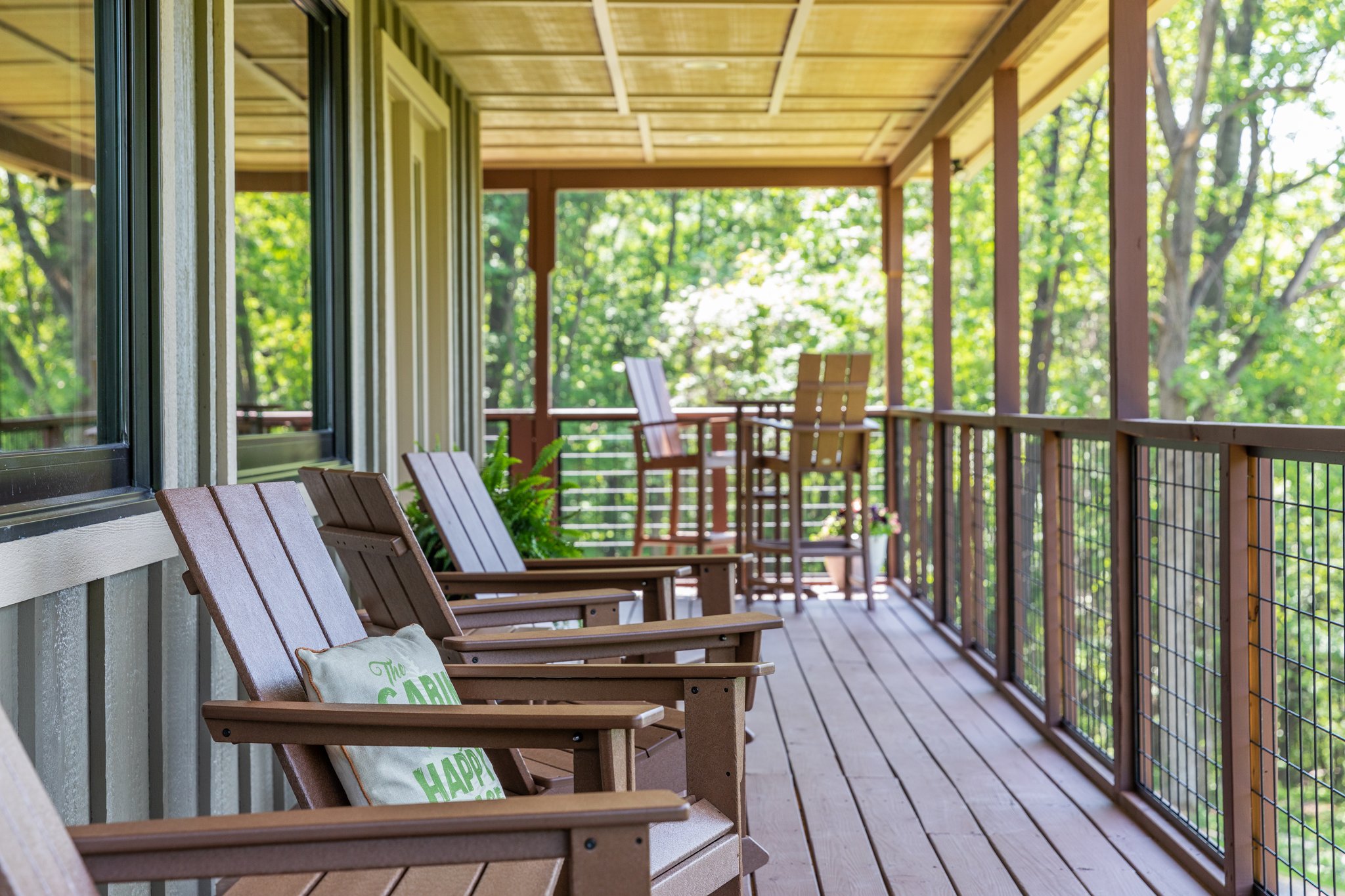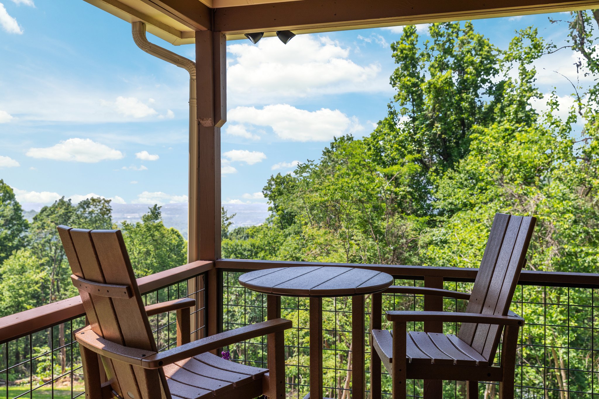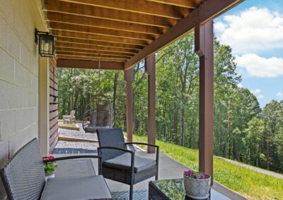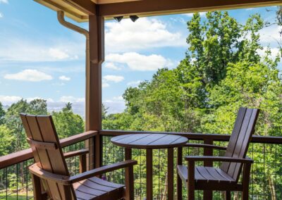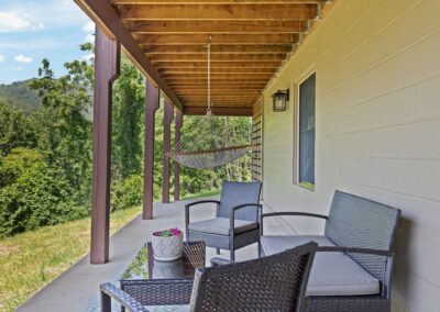 Large upper wrap around deck with rocking chairs, swing, high top table and chairs, and screened in porch with table and chairs. Below is a covered deck with a sitting area, hammock, and birdcage swing. There is also a charcoal grill, Breeo firepit with Pollywood chairs (we provide starter firewood), and cornhole boards. We provide several binoculars and bird watching books if you want to wake up early to see the forest come alive around you.